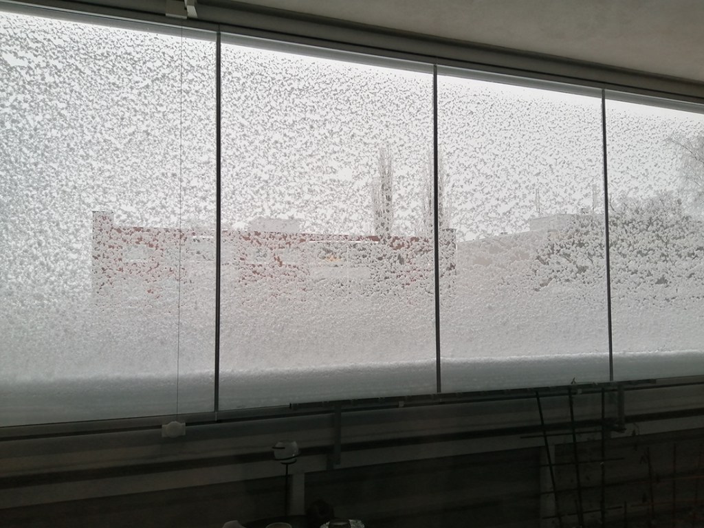 Så här såg det ut på balkongen innan jag hade putsat lite snö bort från vänstra fönstret, det som går att öppna inåt.