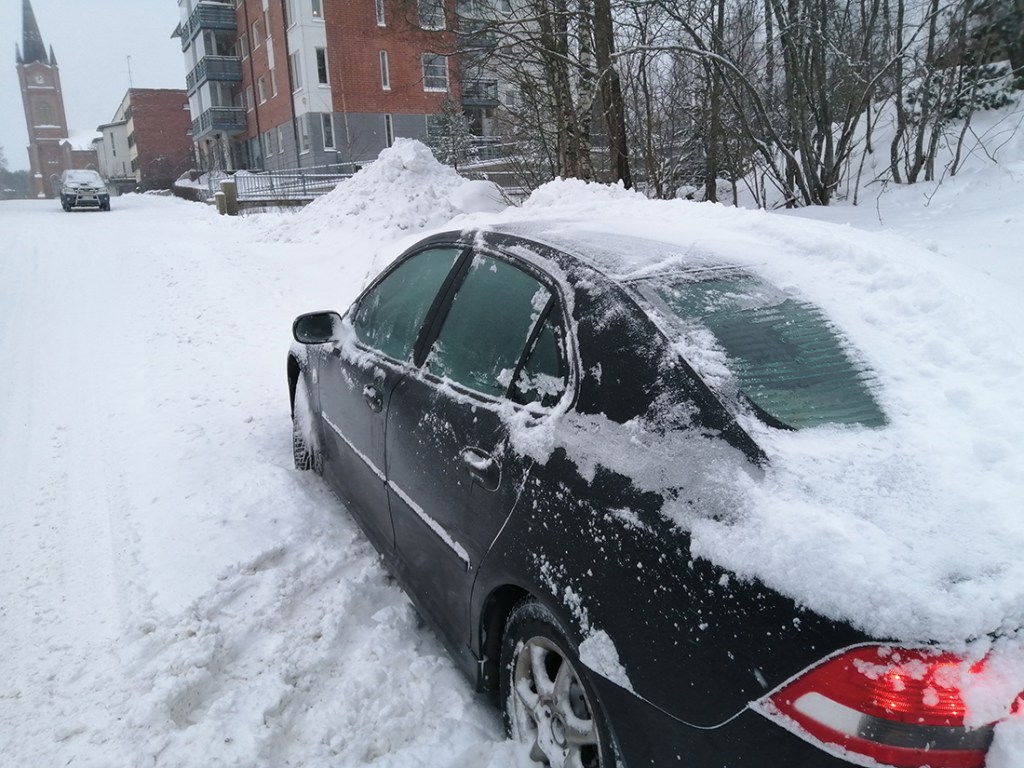 I går sopade jag fram bilen som hade ett fem centimeter tjockt täcke av snö. Snön hade också frusit eftersom det var blidväder kring nyår. Varje dag kommer mer snö. I dag var där ett fem centimeter tjockt täcke igen. I går hade dörrarna frusit fast, så jag behövde en påse med hett vatten för att få upp dem. I dag gick det bra att öppna dem.