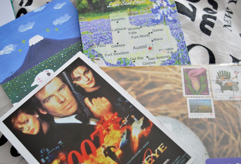 I dag fick jag fyra postcrossingkort samtidigt. Ett från Canada, i inplastat kuvert, det som syns till höger med de tre frimärkena. Har inte öppnat det ännu – spännande! Ett från Taiwan, det som är uppe till vänster. Ett från Texas, det som visar en karta, och sist men inte minst ett kort med James Bond-motiv från Tyskland. Jag har i min profil efterlyst vykort med Bond-motiv, men kan tänka mig att de är svåra att hitta, så därför blir jag alltid extra glad då något sådant dimper in på hallgolvet.