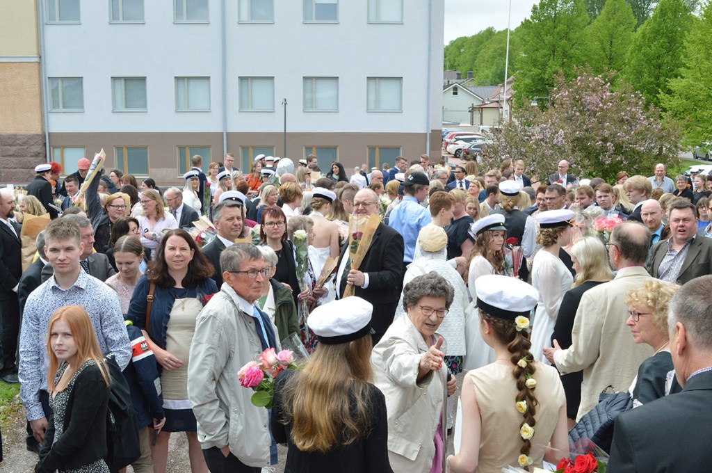 Bilden är tagen utanför hallen, då de nybakade studenterna gått ut och möts av släkt och vänner. Det råkade vara uppehåll då, så den traditionella fotograferingen kunde ske vid Tranbrunnen.