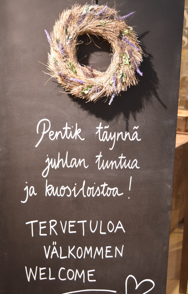 Den här skylten fotograferade jag då det var Shopping by night i grannstaden Borgå för mer än ett par månader sedan. Fritt översatt ”Pentik, full av festkänsla och lysande design”.