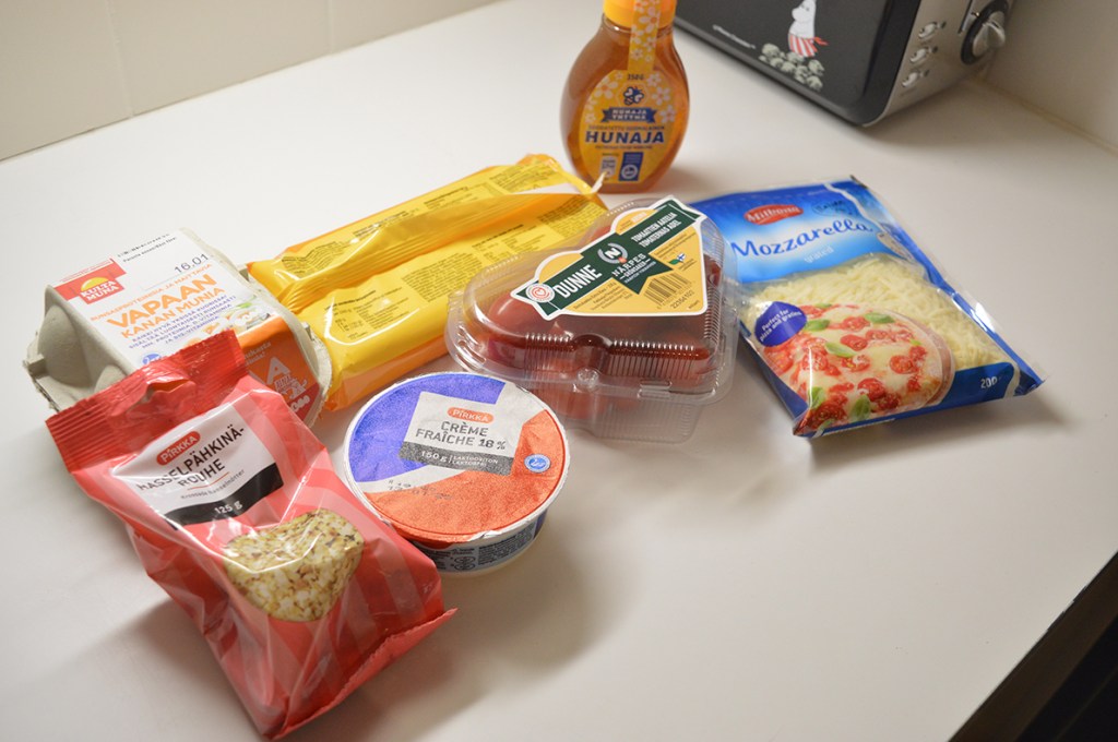 Mördegspastej blev det, och så pass mycket att jag ska ge bort en bit. Tomat i en blandning av mozzarella, creme fraiche, svartpeppar och krossade hasselnötter. Då pastejen var klar ringlade jag själv över lite honung och toppade med fler nötter.