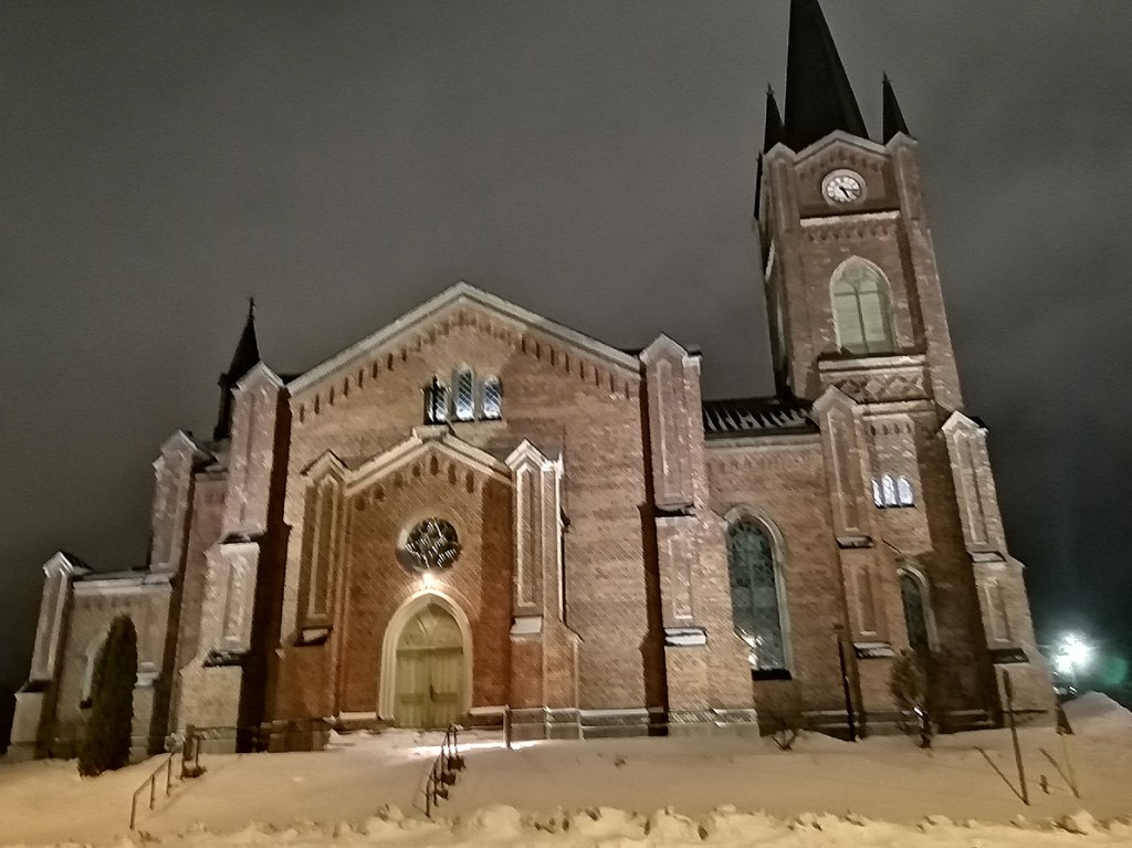 Plus två grader, härligt då det slutat blåsa och snön yrde inte längre ner klockan 18.30 då jag tog kvällspromenaden. Kyrkan sedd ur en annan vinkel. 4431 steg i går, 2700 i dag!