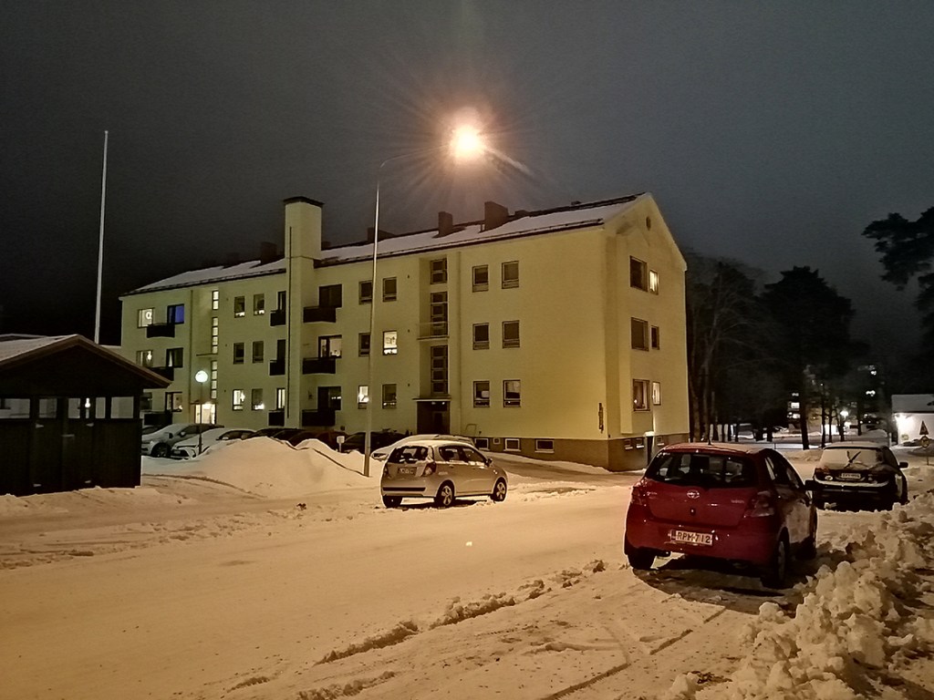 Hälsostegens saldo blev i dag 3872 steg. Det var plusgrader på dagen men mot kvällen frös det på och började också blåsa. Ser ut som om en raket smäller av ovanför huset men det är en gatlampa.