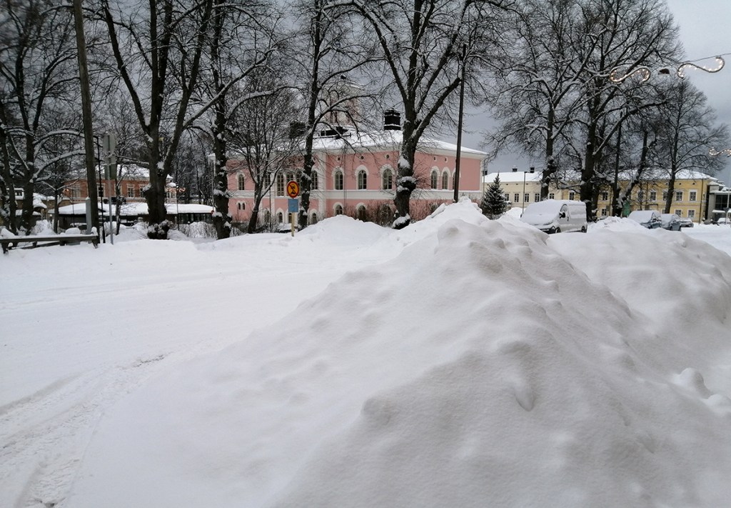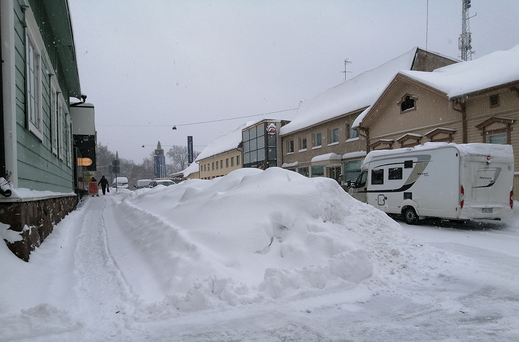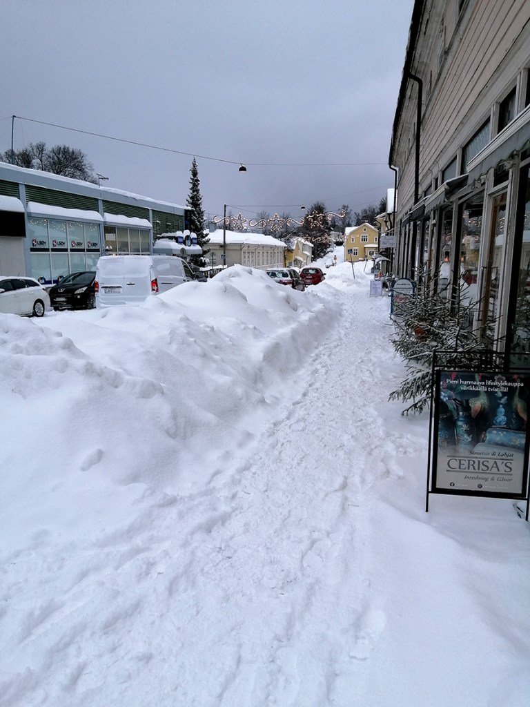 Jag är 168 cm lång. Den här snöhögen är över två meter hög och kanske två meter bred och tio meter lång. Alexandersgatan i Lovisa. Ingen anklagelse mot vare sig stadens snöröjare eller fastigheternas. Ingen hinner med då det vräker ner snö hela tiden. Det var uppehåll korta stunder i dag, såsom här, då jag gör mina ärenden till fots på oplogade trottoarer. 3475 steg och verklig motion, bara att tacka!