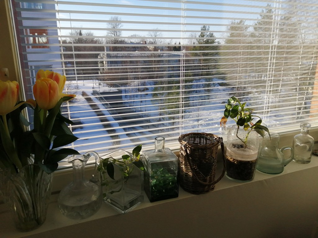 Möblerade om lite på fönsterbrädet i köket. Har många saker i glas och ibland då någon grönväxt tappar blad, eller ”ynglar av sig”, sätter jag dem att rotas här.