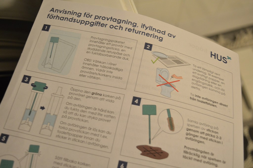 Nu är bajsprovet på väg till ett laboratorium i Helsingfors, i ett pappkuvert, inkapslat i ett plaströr och i en plastpåse där det även finns en absorberingsduk. Troligen för alla eventualiteters skull.