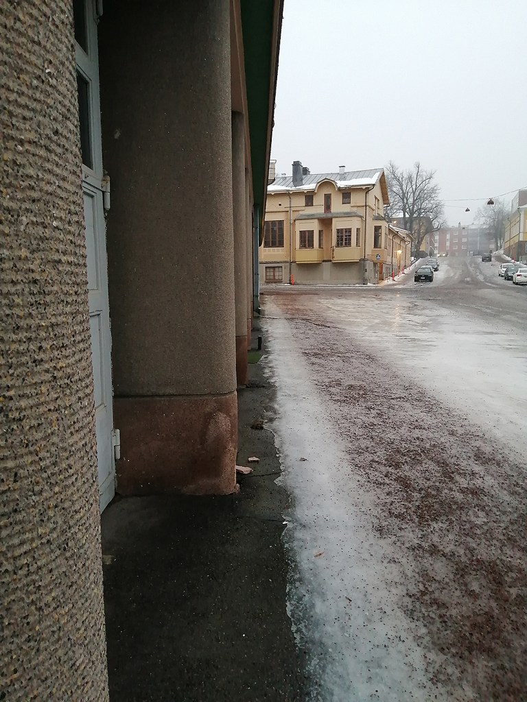 … på den ena sidan av denna ”bana”. Jag hade Icebugs och höll mig till den sandade gången. Men så här ser det ut på många platser. Alla sandar så fort de hinner, men sanden rinner bort eller sjunker in i isen och snön.