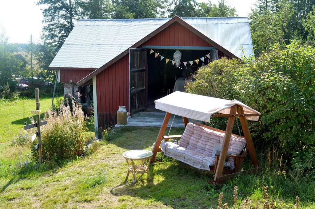 När man har tagit sig upp på den lilla kullen där huset finns ser det ut så här på baksidan av huset, där det finns en liten prunkande gård.