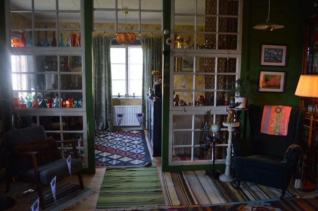 Inne i huset blev jag fascinerad av den här lösningen. Troligen gamla fönsterglas som byggts till en vägg som släpper in ljus mellan rummen. Där förvaras också vackra glas- och konstföremål.