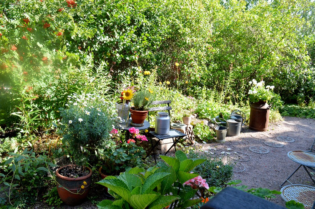 Då man går bort från gården, ner mot Påvalsbyvägen, ser det ut så här. Massor av små krukor till höger och gamla kaffepannor till vänster pryder grusgångens kanter.