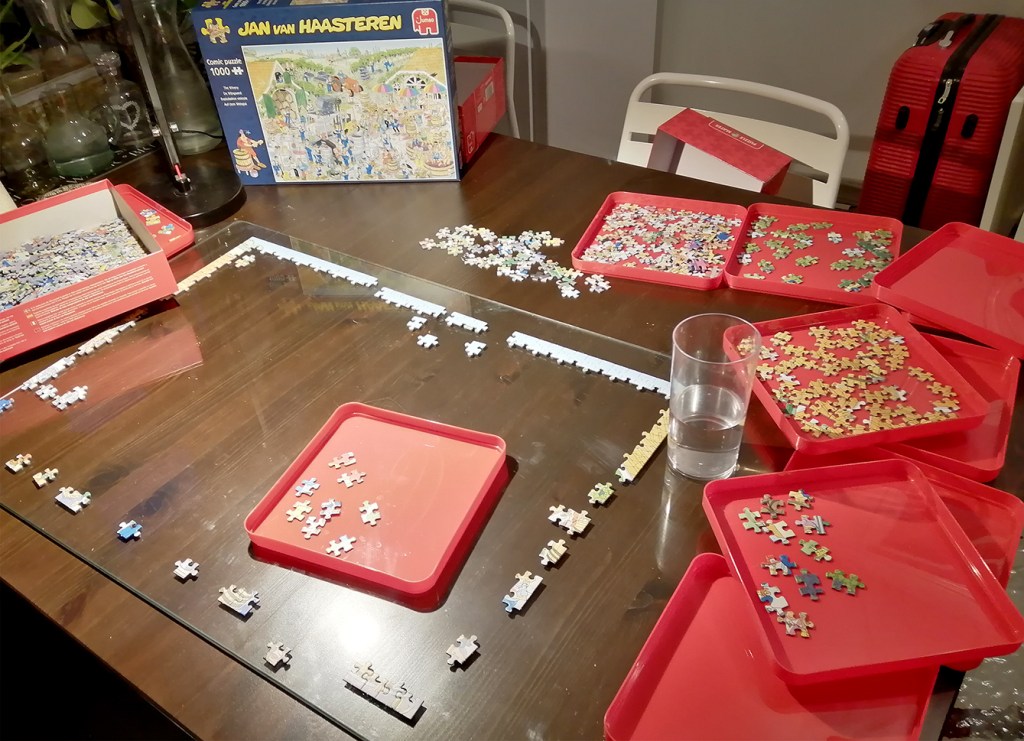 Igår hade jag kommit så här långt med pusslet. Det har gått långsamt så här i början, men då jag köpte sorteringslådor till blev det roligare 🙂