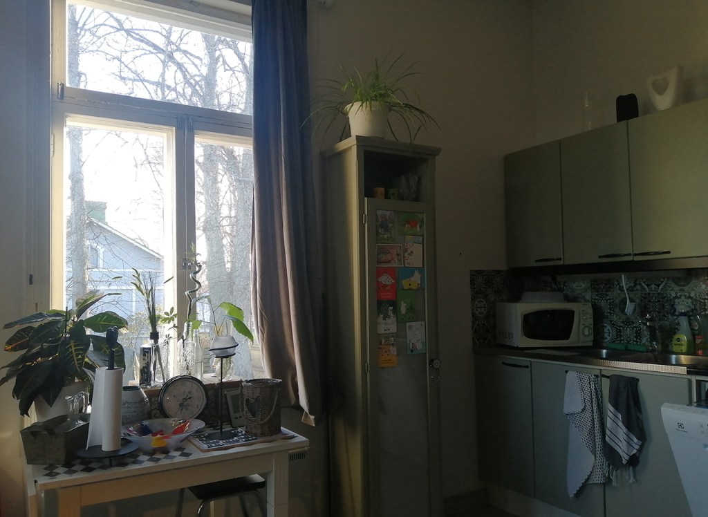 Nu är en av fyra spetsgardiner lagda till vintervila. Den andra i köket får finnas kvar, men det här fönstret tar emot mest blåst och vinterns eventuella snöoväder. Därför har detta fönster fått en vintergardin som dock inte syns på bilden. Den tjocka gardinen dras varje morgon, tillsvidare, åt sidan så att ljuset får strömma in.