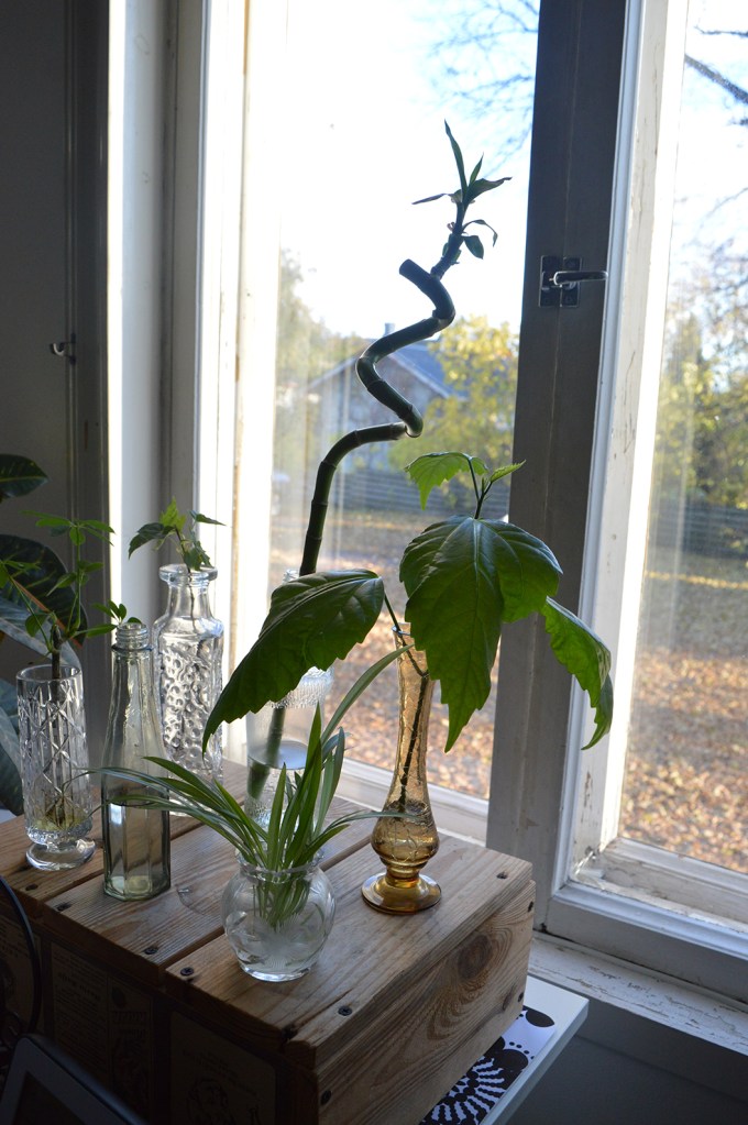 I den bruna vasen har jag äntligen fått ett skott, en avklippt stjälk, av kinarosen att slå rot. Har nu förhoppningar om att få en större kinaros, kanske även hibiskus kallad, då jag planterar moderplantan och den nya med skott i en ny kruka. Har minnen av en stor kinaros som mamma och pappa hade då min syster och jag var barn.