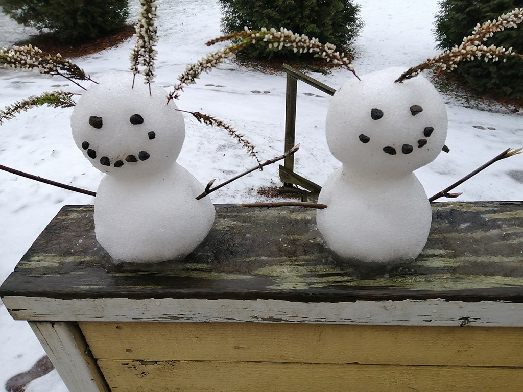 Grannen gjorde för några dagar sedan TVÅ snögubbar. Rester av dem står kvar, det har ju varit plusgrader och regnat. De tappar ögon och tänder först, sedan kanske något hårstrå… Men snäll som grannen är fixade hon nya sådana åt gubbarna.