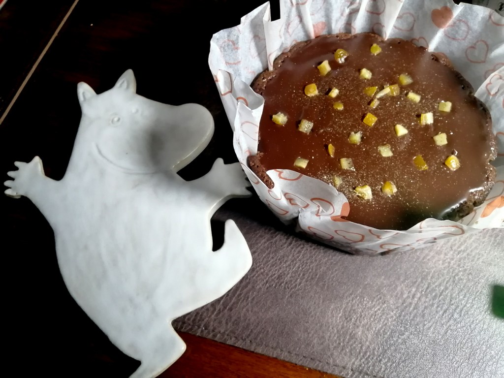 Tänk så lyckligt lottad jag är då jag får en muminfigur i keramik. Man kan ställa något varmt på den eftersom den har små fötter på baksidan. Den händiga personen är också en hejare på att baka. Chokladkakan med smak av apelsin smälter i munnen.