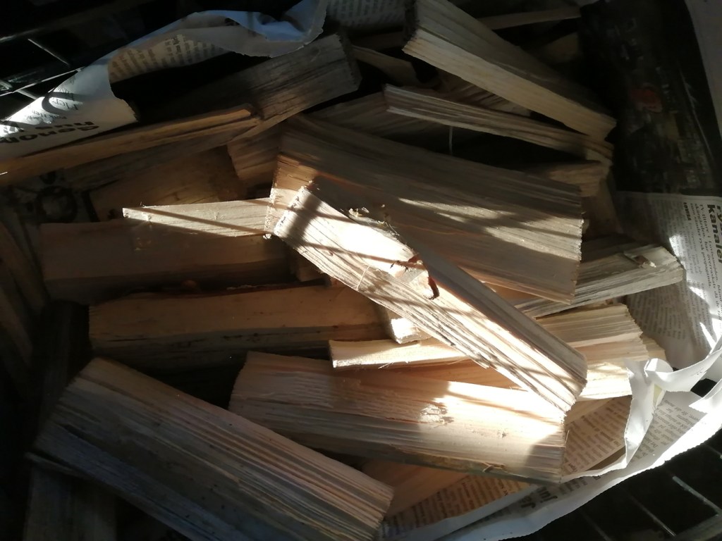 Minus 17 grader hade vi utomhus morse och -13 på dagen vid ett-tiden. Solen lyste i alla fall vackert på min tändved. Alltså på det där små bitarna som hjälper till att få fyr under de större klabbarna i kakelugnen. Tändrosor har jag också så elden brukar ta sig bra med hjälp av bara en tändsticka.