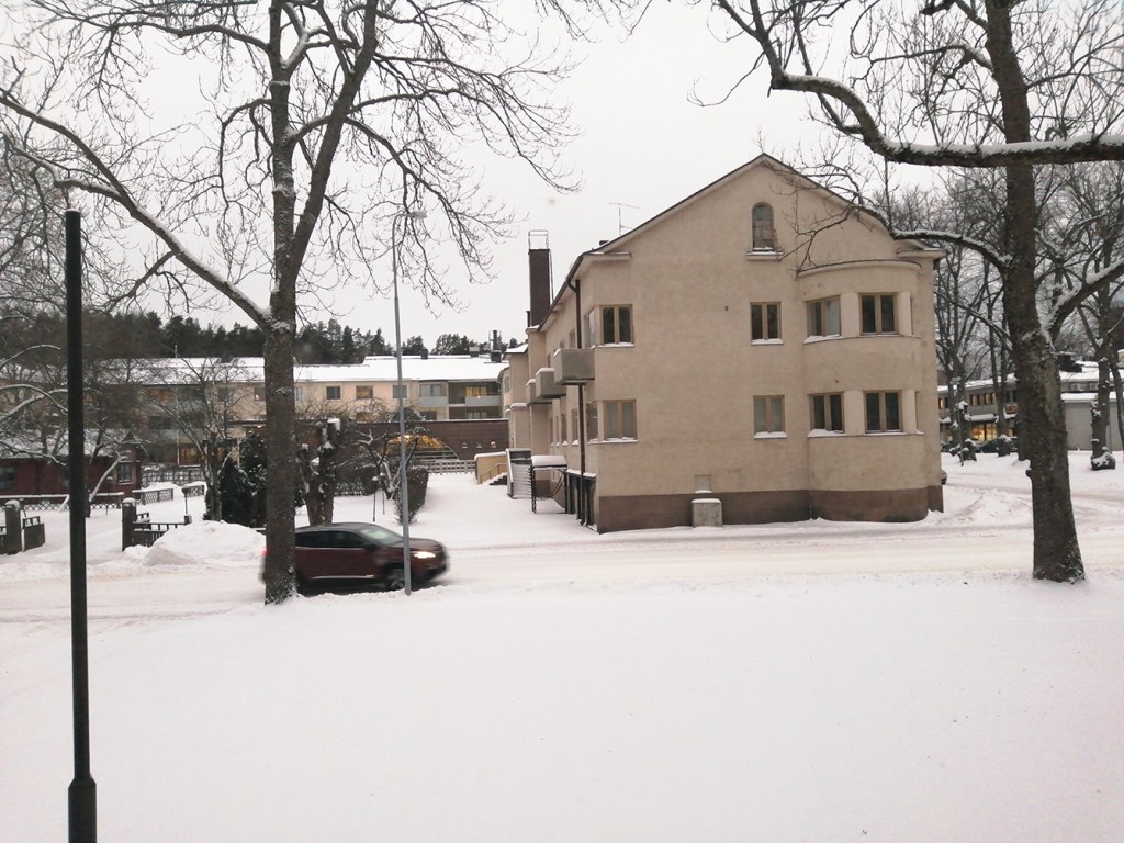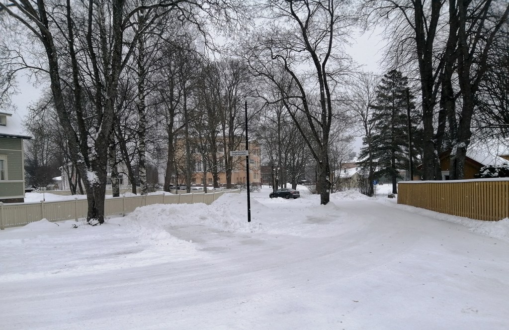 Tog i dag ryggsäcken på ryggen och stavarna i händerna. Går här längs Degerbygatan och i bakgrunden syns Lovisa Gymnasium. Till höger bakom skolan skymtar idrottshallen och till höger om den Lovisavikens skola som är svenska högstadiet. Det blev 2700 steg.