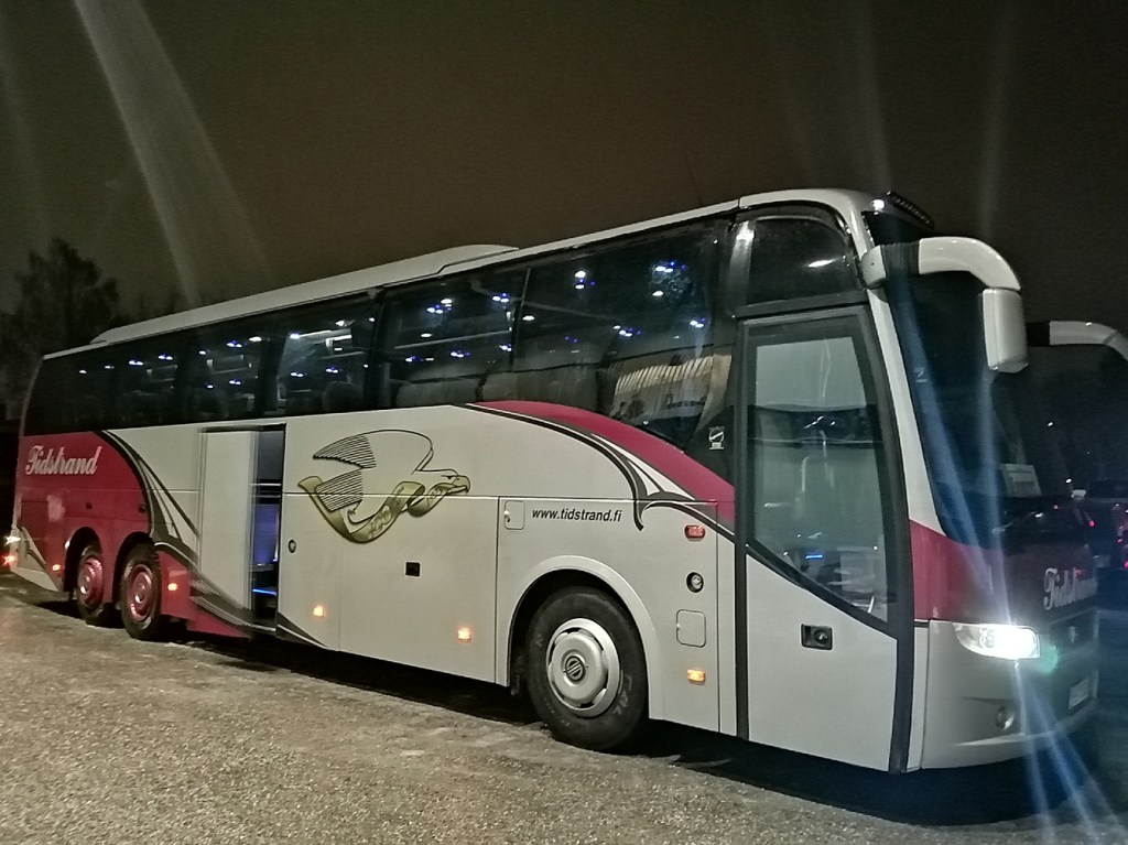 Någon läser böcker, någon handarbetar, andra ser på film eller olika tv-sändningar via telefonerna och surfplattor. Somliga spelar spel på telefon eller så njuter man bara av det förbisusande landskapet. Nu var det ändå sådan dimma att man knappt såg skyltarna längs vägen och efter halv fem blev det mörkt också. Det regnade och var +5 grader i västra Finland.