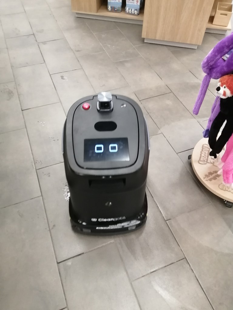 Den här bilden blev lite roligare än jag tänkte mig då jag tog den. Roboten städar på en bensinmack och ett lunchställe där vi stannade på vägen hem från Mynämäki i lördags. Den stannade artigt då jag skulle till toaletten, men den verkade nog ändå lite så där ”va e de nu åter för en gumma i vägen när jag ska städa?”
