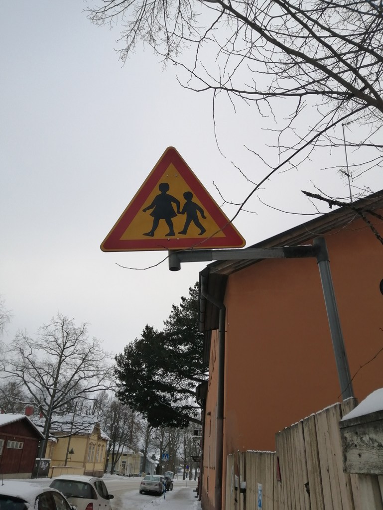 Nä, men här fanns förr två daghem, den röda och den gula byggnaden till vänster. Ganska ofta går här numera också barn över övergångsstället då det fortfarande finns två skolor och ett daghem i närheten.