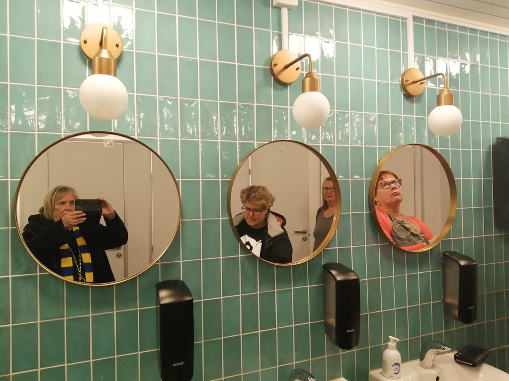 Jag skulle egentligen bara fotografera den fina kakelväggen, speglarna och lamporna i toaletten som hör till Lahnajärvis tämligen nyrenoverade kafeteria. Vi hade paus där då vi var på väg till Lovisa Tors match i Mynämäki för några veckor sedan.