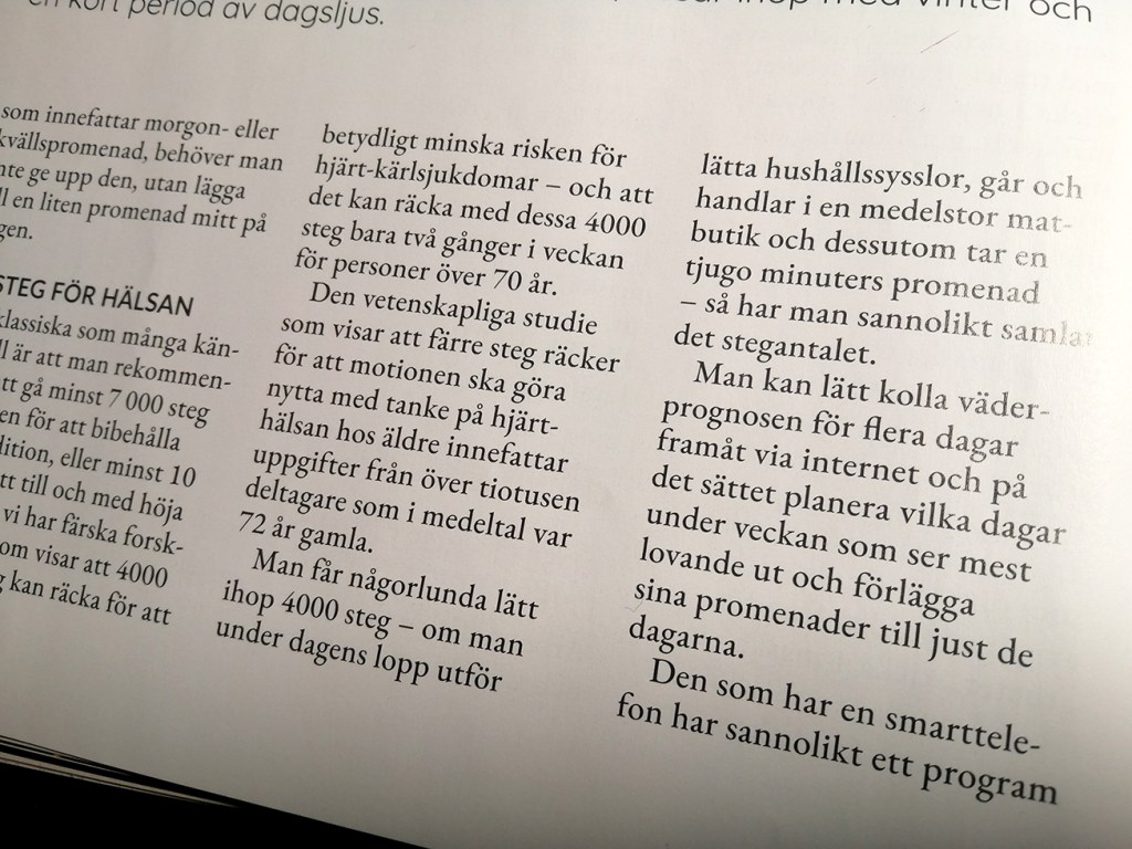 Hälsostegen för 29 januari – 4 februari glömde jag notera här på bloggen igår men de blev 15 250. Hittade också en artikel i en tidning där vi kan läsa att 4000 steg två gånger i veckan räcker bra för personer över 70 år. Nu har jag en bit kvar till det åldersstrecket, men ibland går jag över 4000, ibland blir det bara 1000–2500, men jag går lite varje dag.