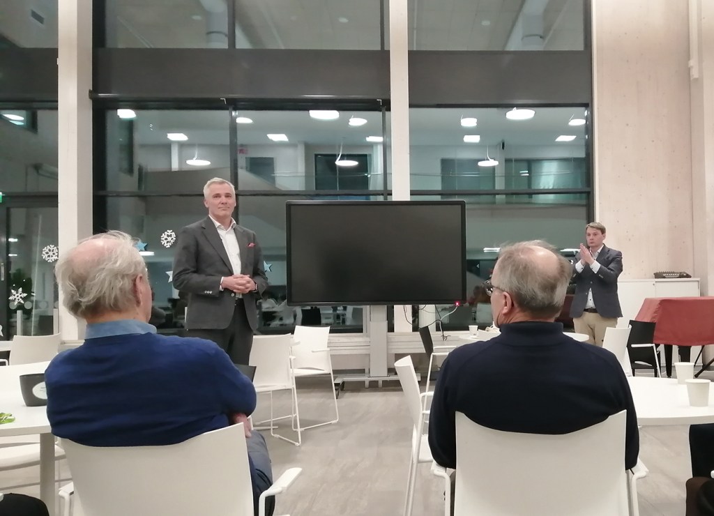 Vi hade ministerbesök från Svenska folkpartiet igår. Anders Adlercreutz från Kyrkslätt är undervisningsminister, och till höger i bakgrunden syns riksdagsledamot Otto Andersson som kommer från Lovisa. En träff för allmänheten arrangerades i Lovisavikens skola, och även om här syns endast två åhörare var antalet mycket högre. Ett trettiotal skulle jag tippa.