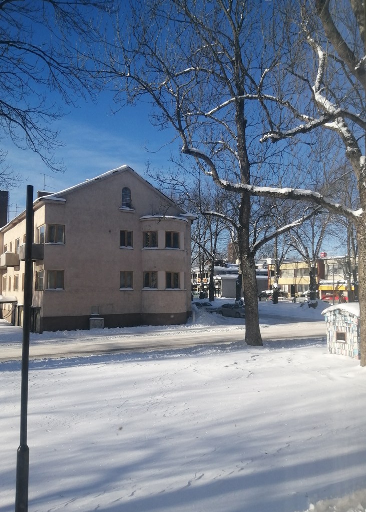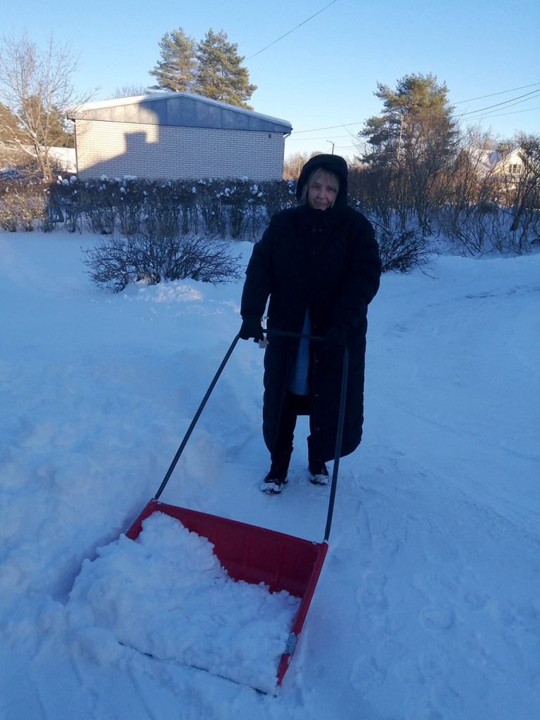 Bilden är från igår, söndag eftermiddag. Solen står ännu ganska högt, det är minus tre grader och snön är inte fasligt tung. Men det hade kommit rätt mycket snö, runt 15 centimeter. Syrran och jag skottade snö på mammas gård och det var faktiskt ganska skönt med frisk luft och lite kroppsarbete. Det är jag som syns på bilden och systern som är hovfotograf.