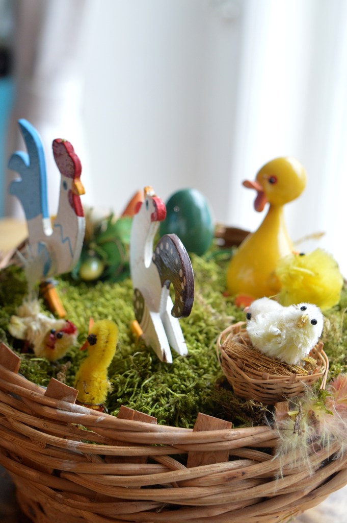 Om ett par veckor har vi påsk, och prydnader av alla de slag har redan börjat dyka upp. Man blir glad av allt det gula och gröna, och alla små söta fåglar eller roliga tuppar. Den här bordsprydnaden hittade jag på Café Favorit. Där har personalen pyntat lite i fönstren också.