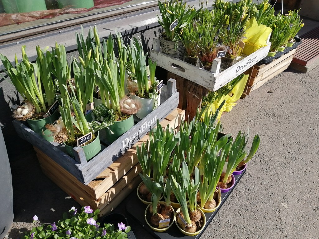 När jag gick förbi en av blomsteraffärerna i tisdags lyste solen och det var så fint med allt det gröna och gula. Nu har vi mulet, stundvis regn och bara +4 grader. Jag ska elda i dag för att hålla elfakturan i schack. De dagar som solen värmer huset behöver jag inte elda, men nu ser det ut som att hela påskhelgen är mulen och kall.