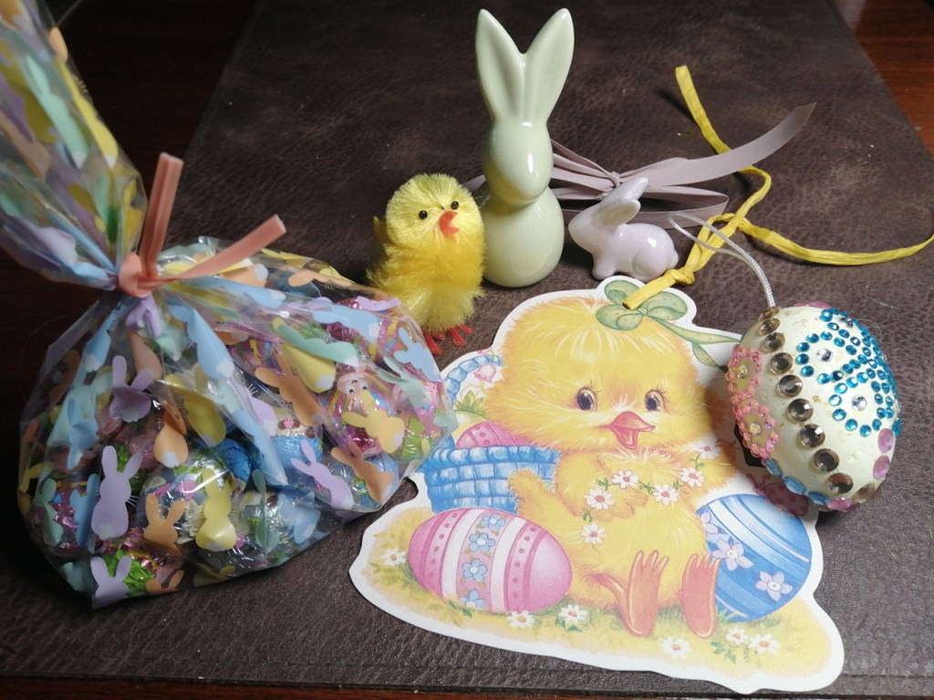 Ett kort, lite godis och små pynt som jag fått av vänner. Jag pyntar vanligtvis varken till jul eller påsk, lite smått kan det bli nån gång, men mest brukar det handla om blommor. Nu får de här pynten vara framme den här påsken 🙂