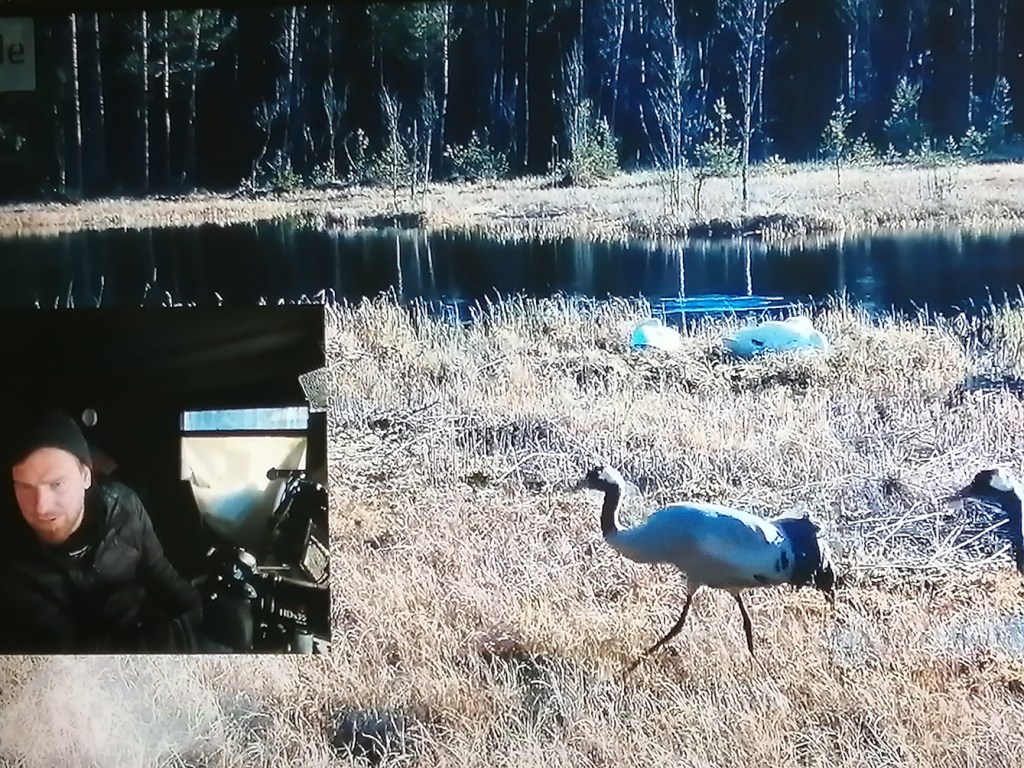 Där är svanar och änder också. Svanarna gillar inte alltid om tranorna kommer nära dem, men igår gick det bra där tranarna försiktigt smög förbi änderna, som också syns på den bild jag tog från teven.