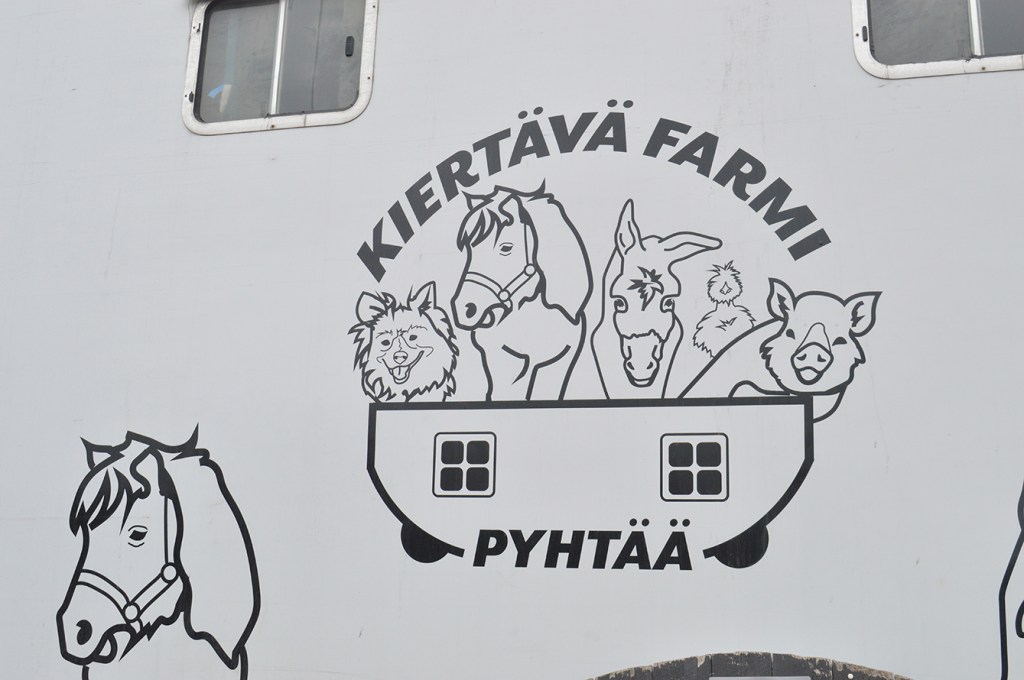 En kringresande farm från Pyttis, det är vad det står på skylten. Hemböle djurpark tar djuren med i sina fordon och besöker allt från daghem till åldringshem och olika evenemang. När jag fotograferade skylten besökte farmen påskäggsjakten i Lovisa på Bastion Ungerns område.
