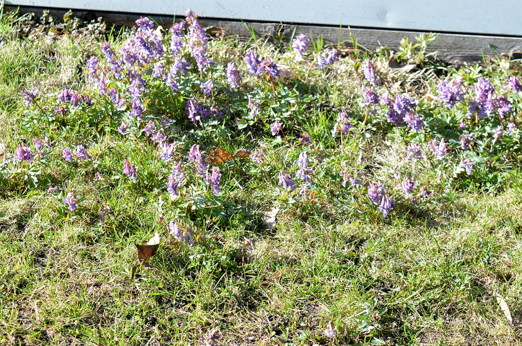 Efter snödropparna, scillorna och krokusarna (eller samtidigt med de två sistnämnda), svämmar gräsmattorna och mark invid husets kant och vid växthuset över av den lila nunneörten. Några humlor surrade redan runt och jagade nektar.