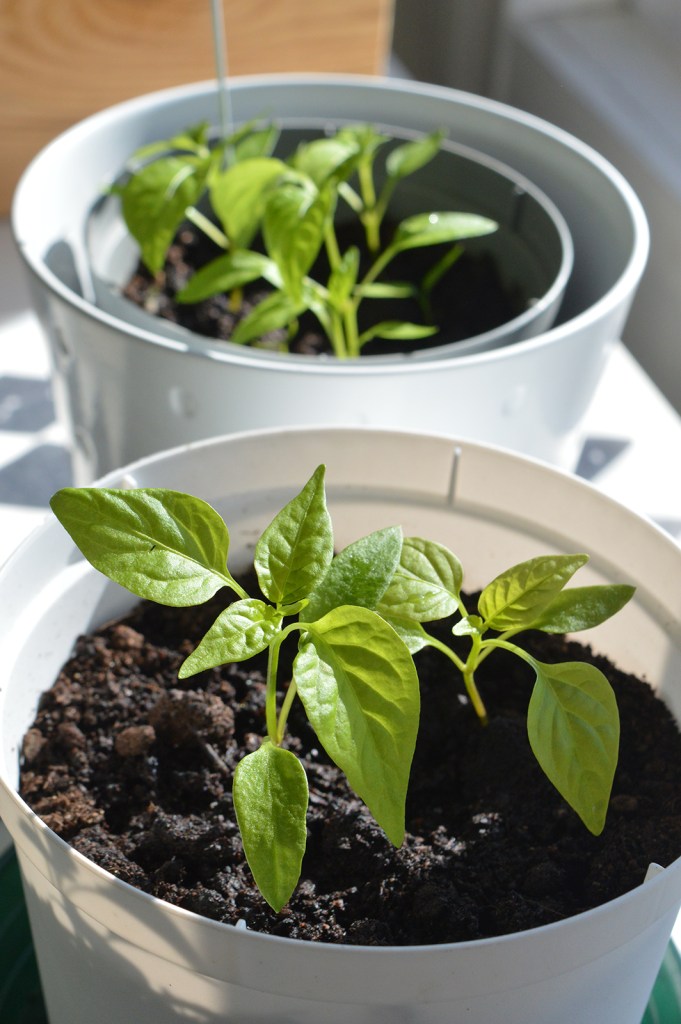 Paprikaplantorna flyttas fortfarande mellan två rum. På morgonen och mitt på dagen får de sol i köket. På eftermiddag och kväll i vardagsrummet. Den största är nu cirka sju centimeter hög.