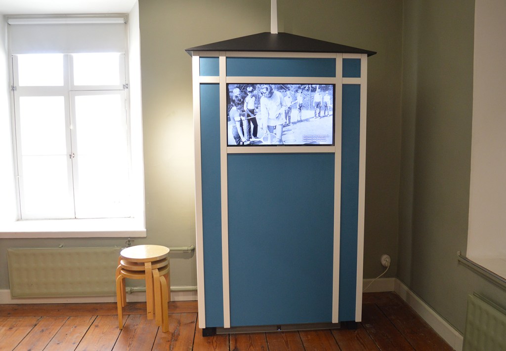 En enkel kopia av en badhytt har ställts upp och där snurrar en video med både levande bilder och stillbilder, svartvita bilder och färgbilder, från tider som gått. Helt underbart!