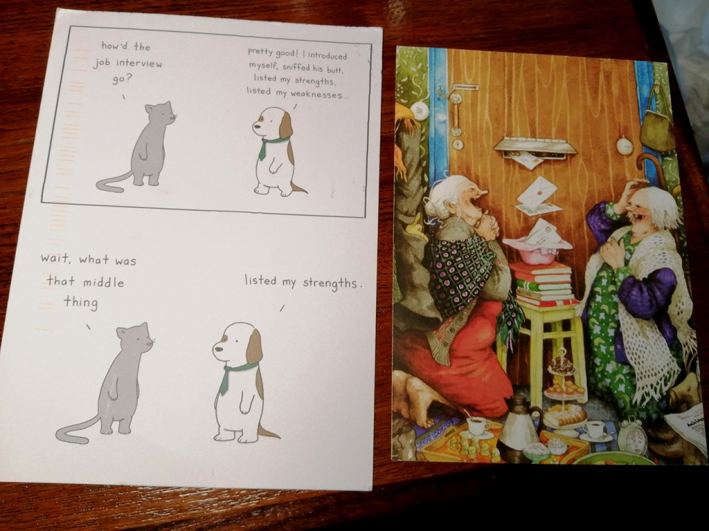 Så de bilder jag visar nu har ingenting direkt med blogginlägget att göra. Två kort jag fick i postcrossingen igår, ett från Nederländerna och ett från USA. Bland mina önskemål där har jag nämnt kort med olika visdomsord eller roliga texter, Inge Lööks roliga tanter, James Bond-motiv, Mumin och Snobben.