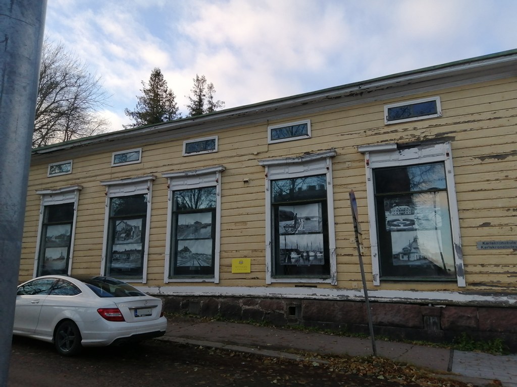 Det var en gång… en vacker träbyggnad, i min barndom och ungdom fanns här en järnhandel. Många andra företag har också verkat här under årens lopp, men nu har byggnaden förfallit så till den grad att den knappast kan räddas. En fin utställning med bilder från gamla Lovisa finns dock i fönstren som vetter mot Karlskronabulevarden här, och mot Drottninggatan. Man behöver inte gå in och titta på bilderna.