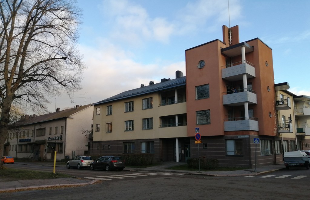 Snett mitt emot gamla järnhandeln finns servicehuset Esplanad med boende för seniorer. Här finns en också en liten simbassäng, ett litet gym, ett lunchställe, samlingslokal för möten, frissa, min massör, ibland försäljning av kläder osv. Byggnaden till vänster är ett gammalt hotell och där har funnits restaurang och pub. Står tyvärr också tomt sedan många år tillbaka 😦