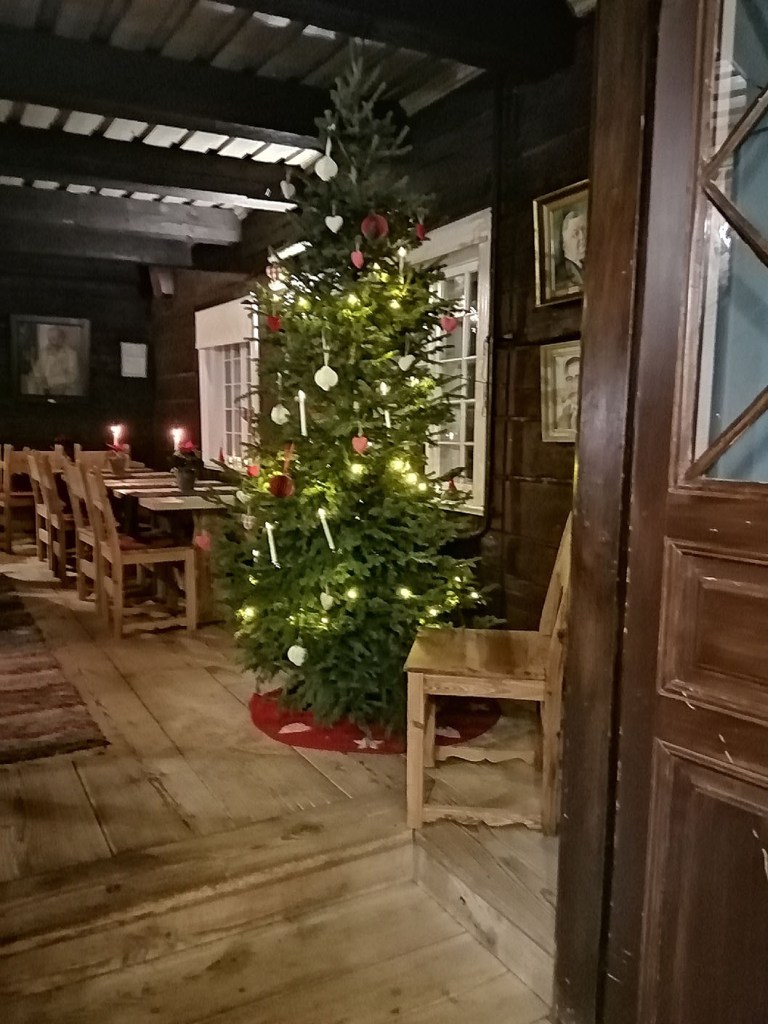 Förrätterna dukade. Här finns sådant som jag gillar, allt från fisk till sallad och på ett bord intill fanns bröd. Ärligt sagt har jag aldrig gillat traditionell finsk husmanskost, och inte den typiska julmaten som består av morotslåda, kålrotslåda, potatislåda, ibland lutfisk osv. Skinka går an men då äter jag den på knäckebröd med stark senap 😀Vackra julgranar fanns i två rum, också här i den gemytliga ”stugan”.