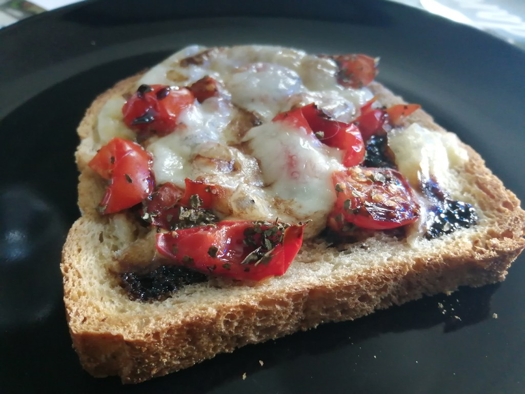 Jag känner ändå åter glädje över att orka göra nånting att äta till mig själv. Tomaterna är från växthusodlingen. Mozzarellan från affären, svartpeppar och basilika och sedan lite balsamico. Brödet strök jag lite smör på, vitlökssmör hade egentligen varit bäst, om man gillar sånt. Men det hade jag inte hemma. Bruschetta mozzarella – något jag lärde mig uppskatta då jag var på Corfu 2017.
