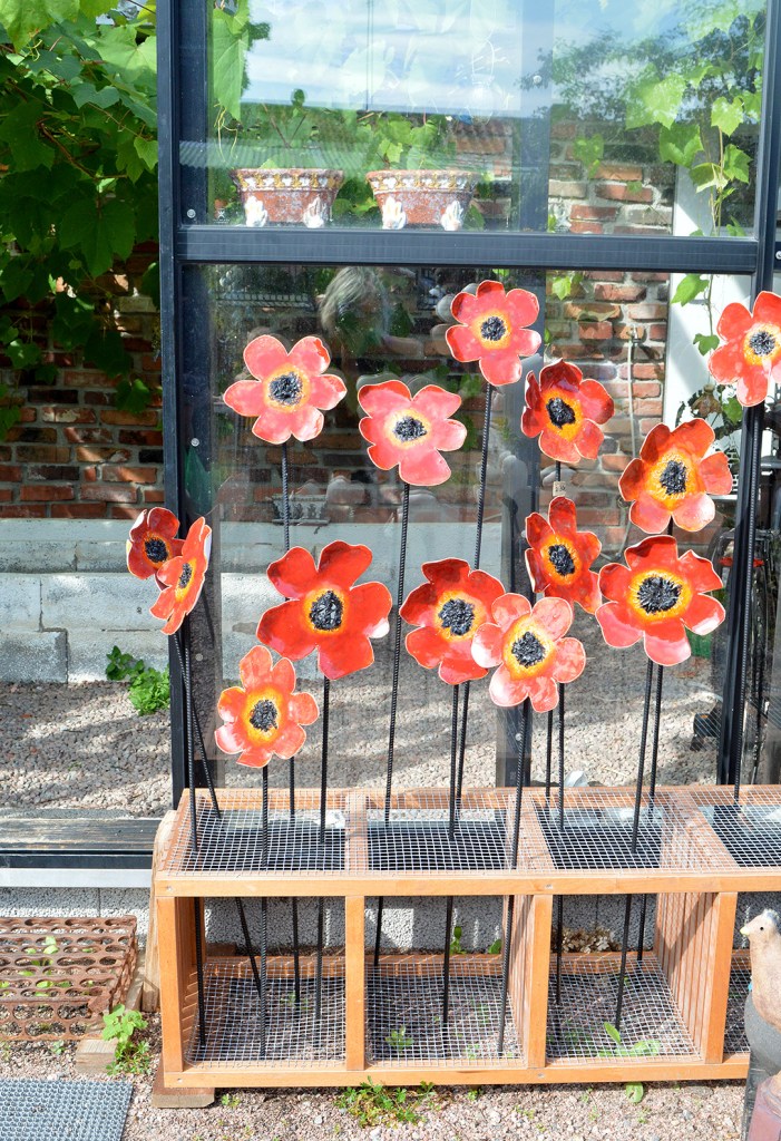 Några av Kaisa Korpelas härliga keramikarbeten. Blommorna kan fungera som prydnader i sig men också som stöd för klättrande växter. Var och en kommer säkert på användningsmöjligheter själv 🙂