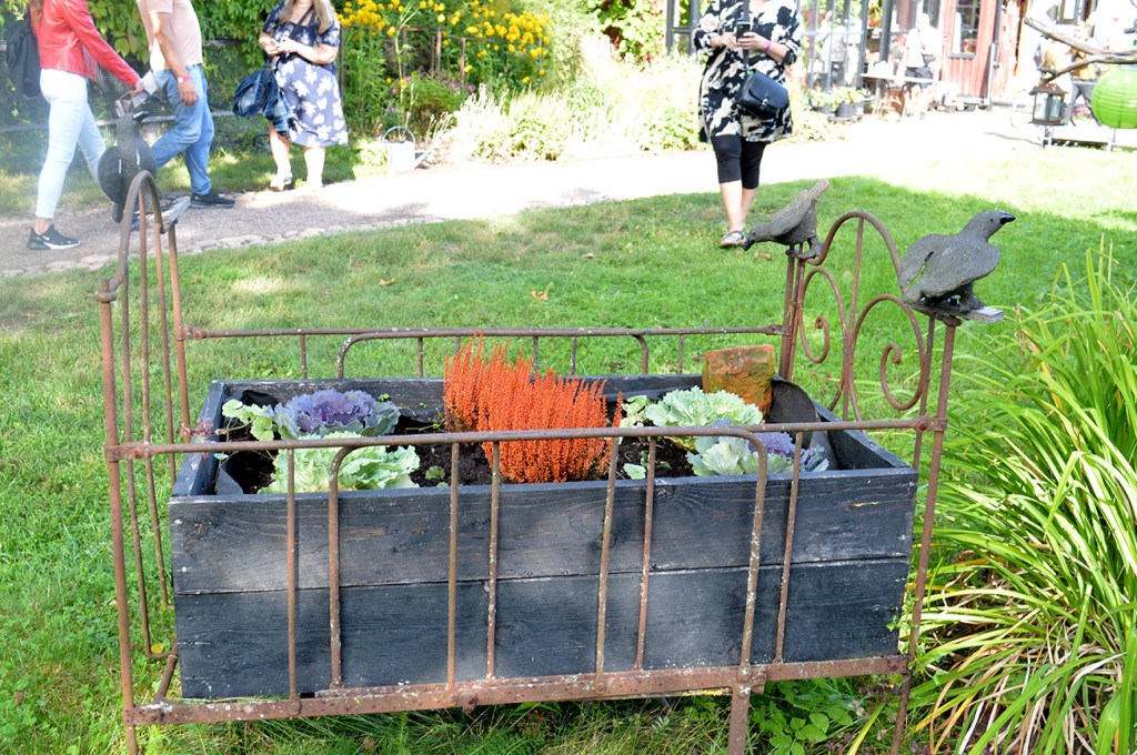 Tips för höstträdgården! Jag kommer inte på nu vad de där som liknar kålväxter till höger och vänster heter. Ljungen i mitten, det finns ju färgade varianter. Somliga gillar dem, andra inte. Jag tycker den här gamla sängen och lådan med höstväxterna är fin. Fanns på gården till Pitkänpöydäntalo som jag besökte under Lovisa Historiska Hus den 24 augusti.