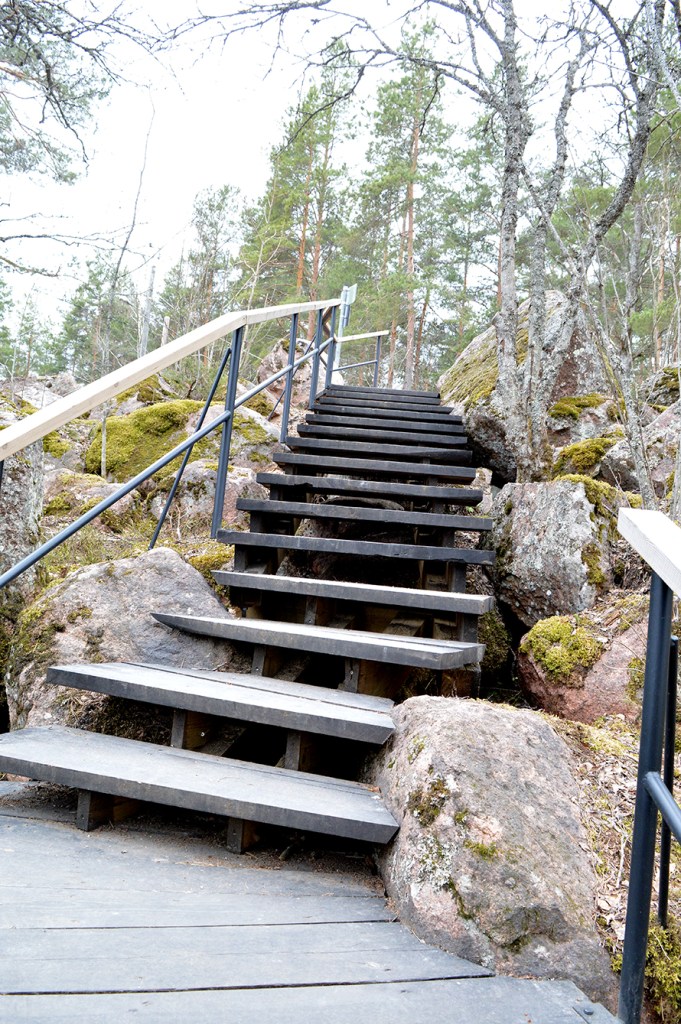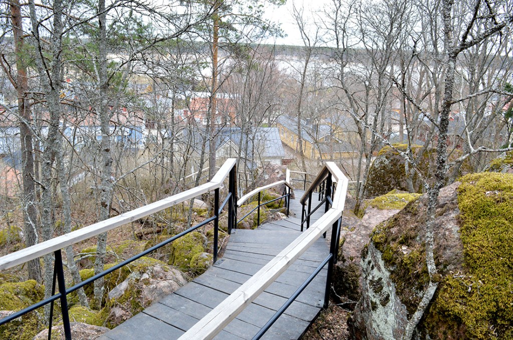 Här börjar vägen upp mot trapporna. Inte mycket grönska att tala om, men små mössöron och vårens blommor syns här och där.Otroligt fint att de här trapporna byggdes i en terräng som annars var helt oframkomlig på grund av alla stenbumlingar. Kanske där fanns en stig någon gång, men det här är ju mycket finare, mer praktiskt och har garanterat höjt konditionen för otaliga personer som nyttjar trapporna.Då lövverket ännu inte är tätt är utsikten över gamla stan i Lovisa och Lovisaviken fin. På andra sidan vikens strand byggs Drottningstranden för bostadsmässan som vi står värd för 2023. Bullret därifrån nådde ända upp till åsens trappor 🙂Och så några trappsteg kvar innan vi når målet, Östra Åsvägen, ”Frälsisbackans” topp.