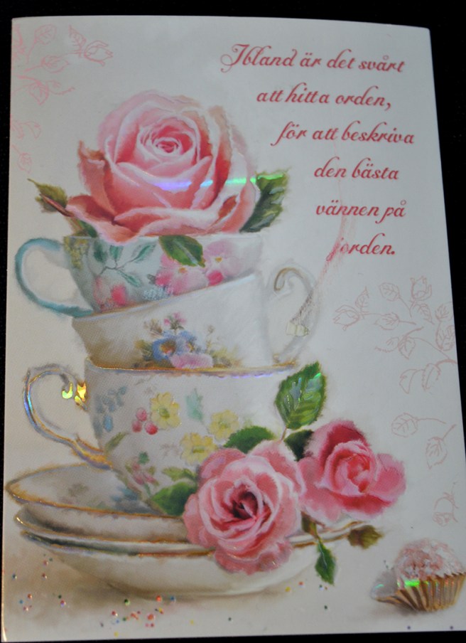 Den här hälsningen på namnsdagen fick jag av grannen Ritva. Hon är bra på att skicka små kort med texter och överraskningar av olika slag. Sådana vänner gör mig glad ❤