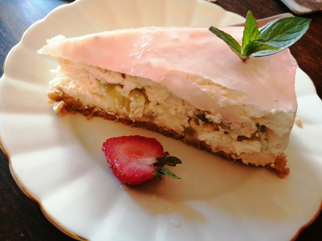 En fräsch kaka gjord på rabarber och ost gottade jag mig åt på Café Favorit i Lovisa i dag.