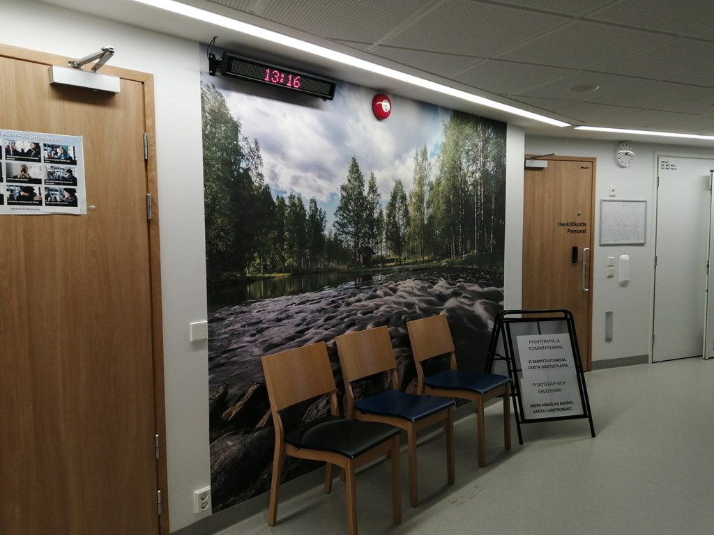 När gör du fredag idag? – Jag förstår inte som finlandssvensk vad ”göra fredag” betyder. Men om det handlar om när fredagen övergår i avkoppling så blev det efter klockan 18. Bilden visar ett väntrum i Borgå sjukhus där vi var med mamma i dag på en efterkontroll. Hon opererades ju för en hjärntumör för sex år sedan. Fram tills nu har allt varit bra, och vi hoppas att beskedet också efter denna kontroll är bra.