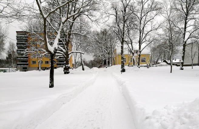 På väg till ett fotouppdrag, som handlar om vad annat än snöröjning? En plusgrad och därmed också aningen slask och lite halt på sina ställen.På väg bort från fotouppdraget. I de här kvarteren bodde jag 2014–2015. När jag kom hit för att ta fotot höll en traktorförare på att köra bort snö, troligen för att ge plats till MERA snö som antagligen kommer snart igen.