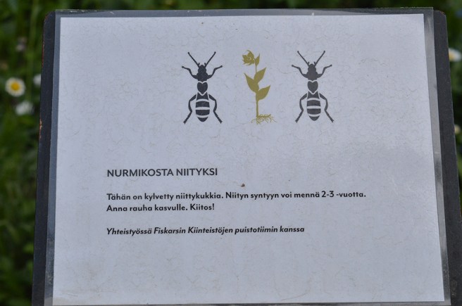 Från gräs till äng. Här har man planterat ängsblommor. Det kan dröja 2–3 år innan en äng föds. Låt växandet ta sin tid (rauha = fred, lugn). Tack!